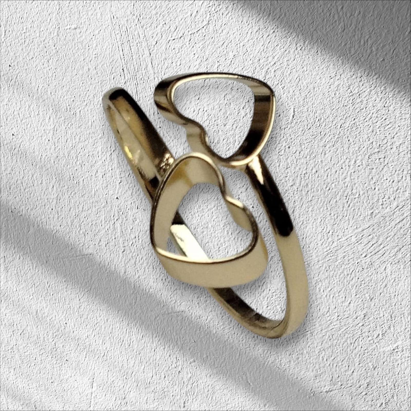 Delicado, moderno e cheio de significado! O Anel Corações Vazados traz dois corações entrelaçados em uma estrutura aberta que simboliza o amor em sintonia. Com acabamento dourado e design minimalista, é ideal para o dia a dia ou para ocasiões especiais.