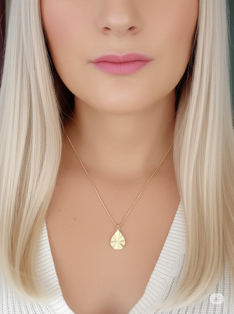 Este colar banhado a ouro 18k apresenta uma corrente delicada que culmina em um pingente em formato de gota com uma textura sutil e elegante. As linhas texturizadas capturam a luz, criando um brilho discreto e sofisticado. Uma semijoia versátil, perfeita para complementar looks casuais ou mais formais com um toque de elegância minimalista. O fecho ajustável permite adaptar o comprimento para diferentes decotes. Você vai apreciar a beleza simples e o toque de brilho deste colar!