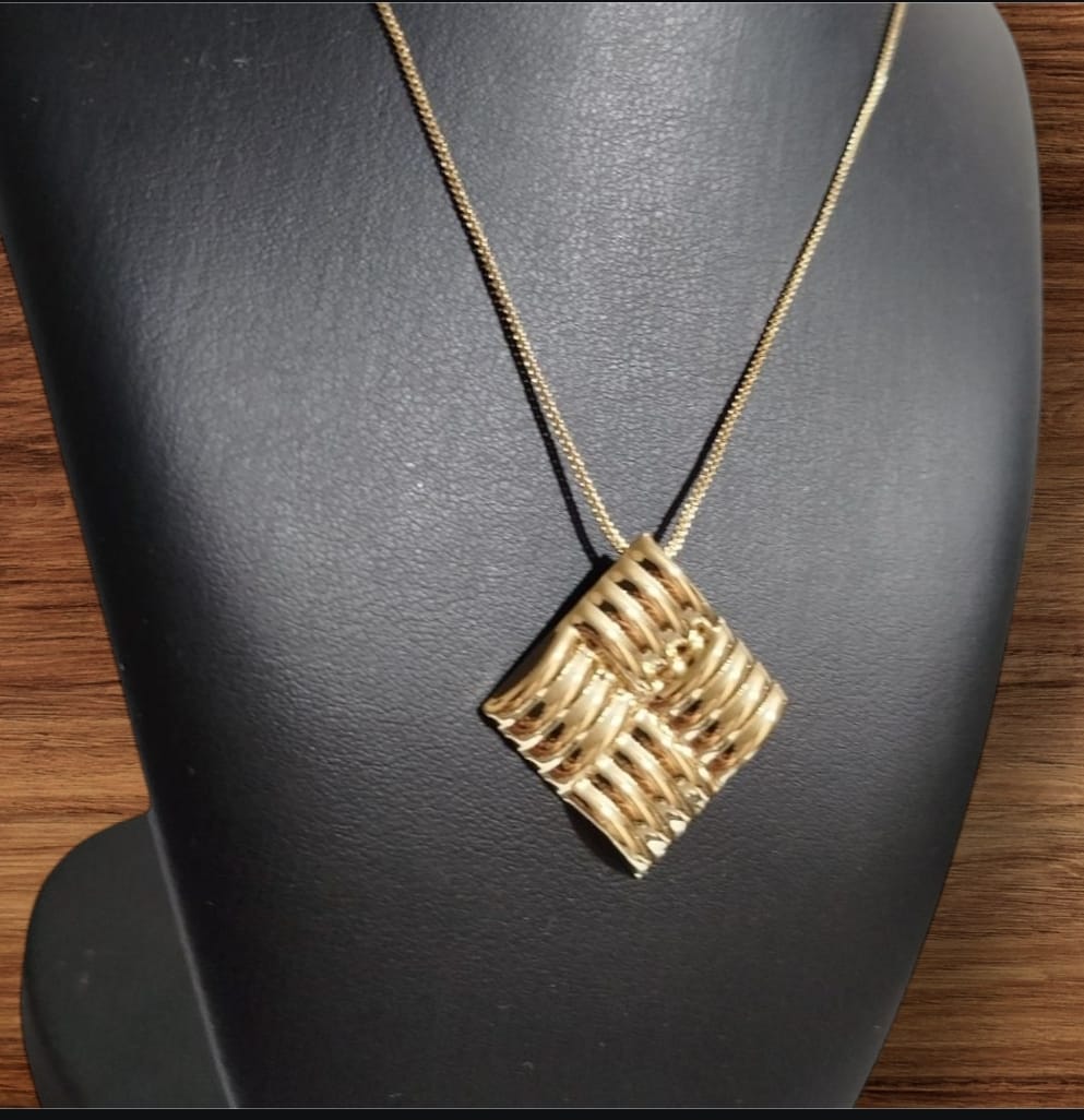 Elegância e estilo em um só acessório. O Colar Geométrico Trançado é uma peça impactante, com um design em formato quadrado composto por linhas entrelaçadas que remetem à textura de ondas. Seu banho dourado proporciona um brilho sofisticado, ideal para complementar looks modernos ou clássicos.